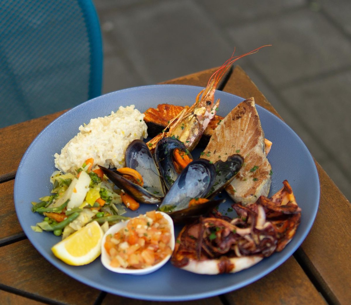 Parillada de fruits de mer : saumon, thon, crevettes, calmars et moules grillés à la plancha. Servie avec légumes de saison, riz crémeux et salsa fraîche. Un plat généreux, à partager.