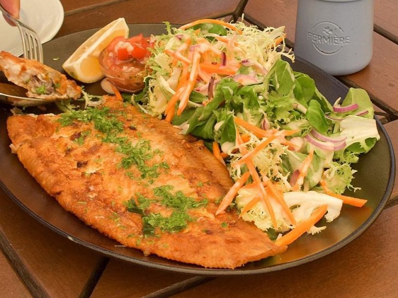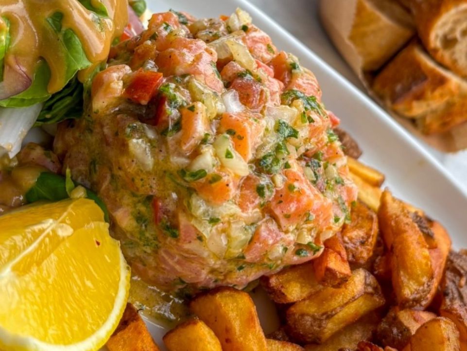 Tartares minute de poisson de qualité, aux herbes et citron, servis avec frites maison et salade.