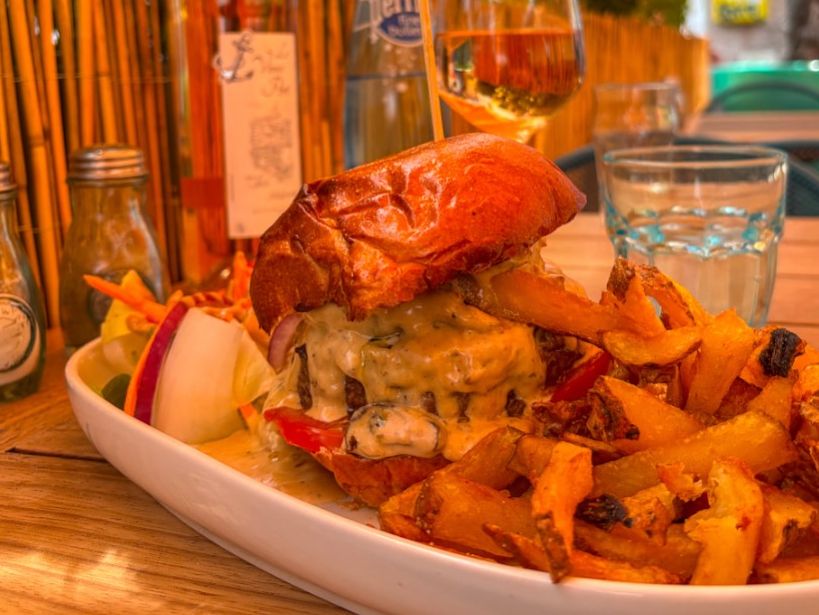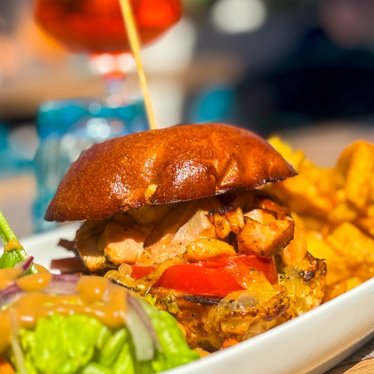 Burger “Pesce” : pavé de saumon grillé à la plancha, nappé d’une rémoulade maison. Garni de tomates fraîches et oignons confits dans un pain moelleux; servi avec frites maison croustillantes et salade fraîche. Un plat généreux, coloré et ensoleillé, idéal face au Vieux-Port.