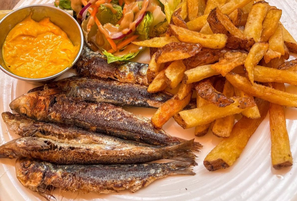 Sardines fraîches frites à la perfection, servies avec frites maison croustillantes, salade croquante et sauce maison. Un plat authentique, généreux et plein de caractère, à partager autour d’un verre bien frais, en terrasse avec vue sur le Vieux-Port.