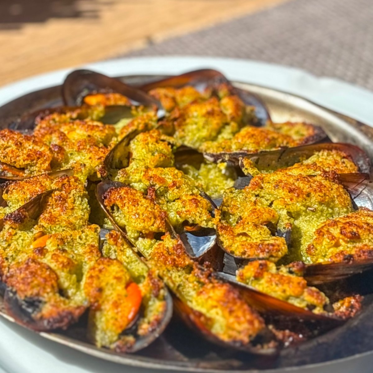 Grand classique du Sud : moules fraîches gratinées au four, chapelure dorée parfumée au persil, à l’ail et à l’huile d’olive. À partager en toute convivialité, idéalement en terrasse face au Vieux-Port.