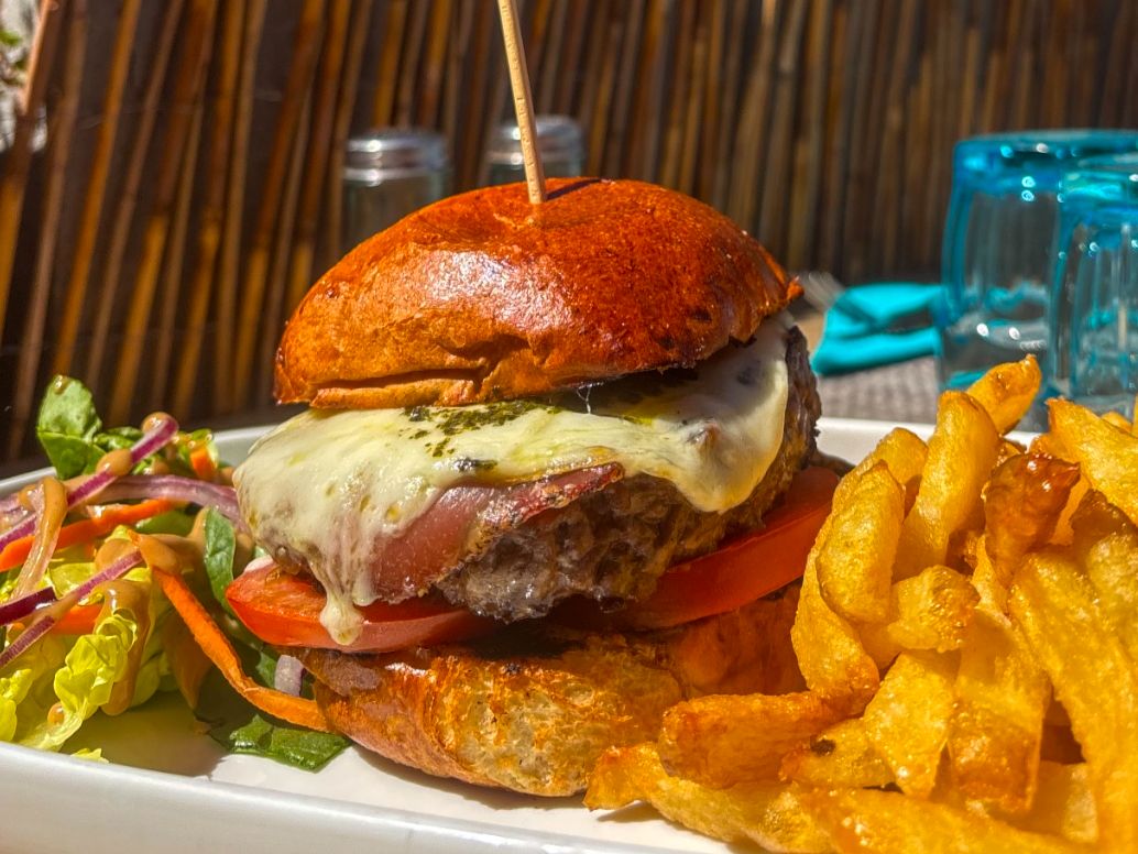 Burger italien Pesto & Mozzarella : steak de bœuf grillé, mozzarella fondante, pesto au basilic maison, tomates confites et roquette, dans un pain brioché doré. Servi avec frites maison croustillantes et salade croquante — un burger gourmand aux saveurs méditerranéennes.