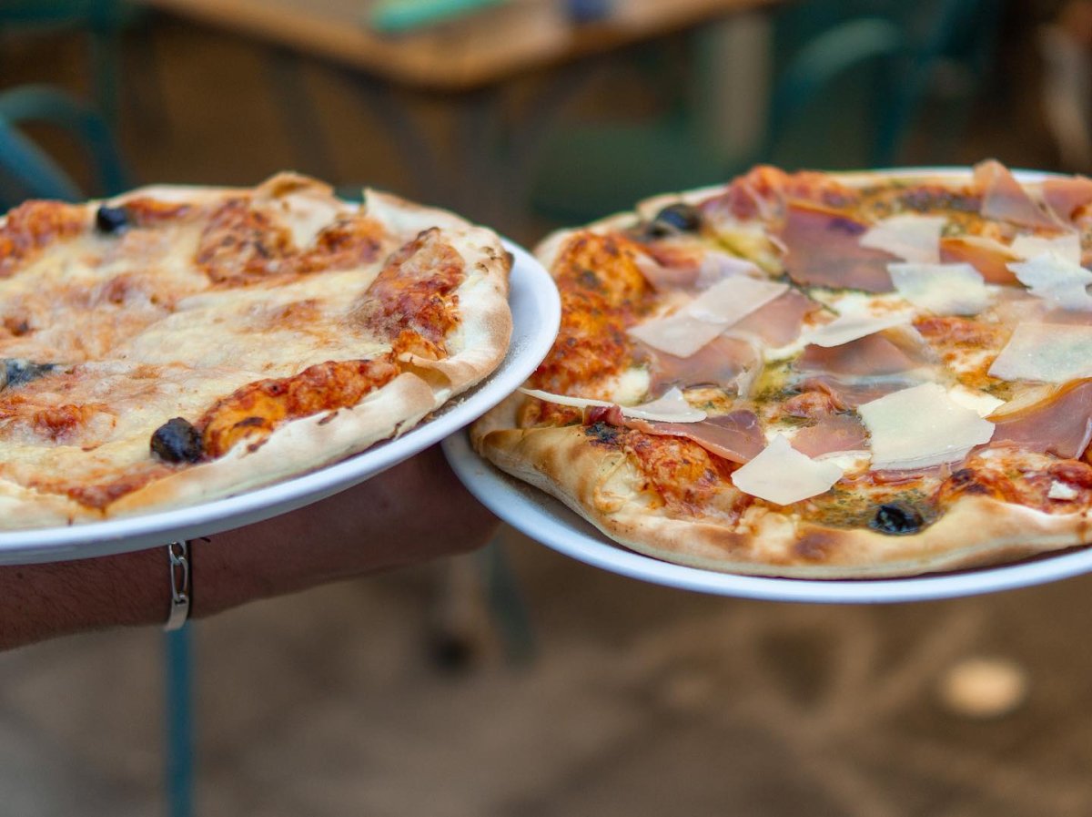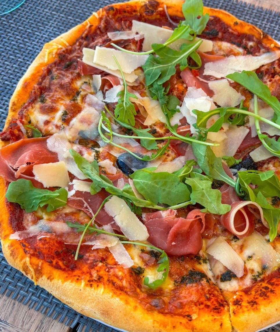 Sauce tomate, mozzarella, Grana Padano, jambon cru, pesto : Gourmande et parfumée.
