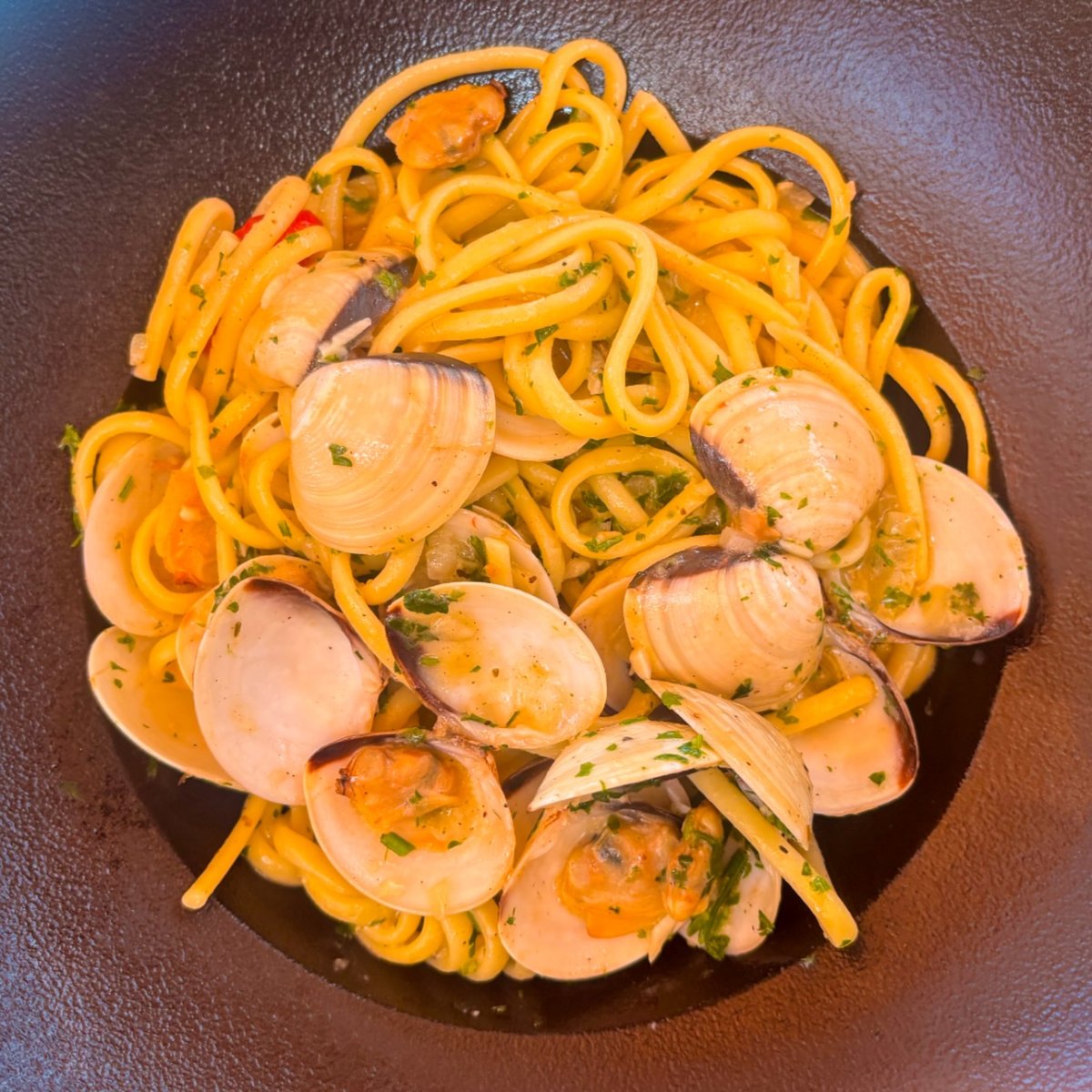Grand classique italien aux accents méditerranéens : linguines sautées à l’huile d’olive, ail et persil, généreusement garnies de palourdes au goût délicat et iodé. Coquillages juste cuits pour préserver leur finesse, sauce légère qui enrobe les pâtes pour un équilibre terre–mer parfait. Un plat simple, authentique et parfumé, à savourer face au Vieux-Port.