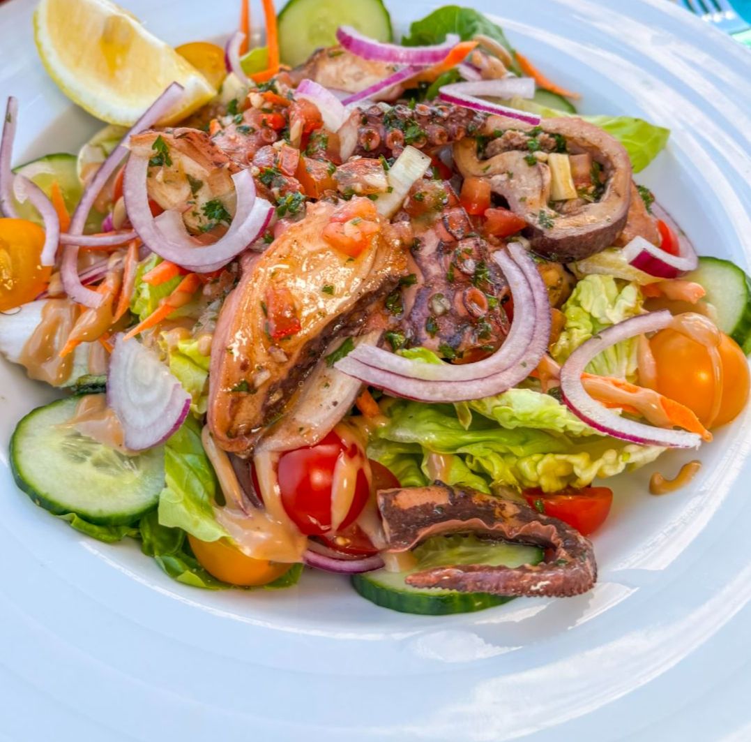 Un plat frais et ensoleillé aux accents méditerranéens : notre salade de poulpe mariné et grillé, mêlée de tomates cerises, concombre et oignon rouge, relevée d’une vinaigrette aux herbes et citron. Colorée et légère, elle se déguste en entrée ou en plat, idéale en terrasse face au Vieux-Port.